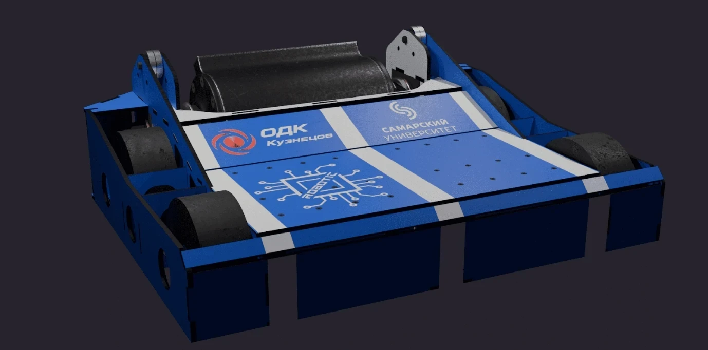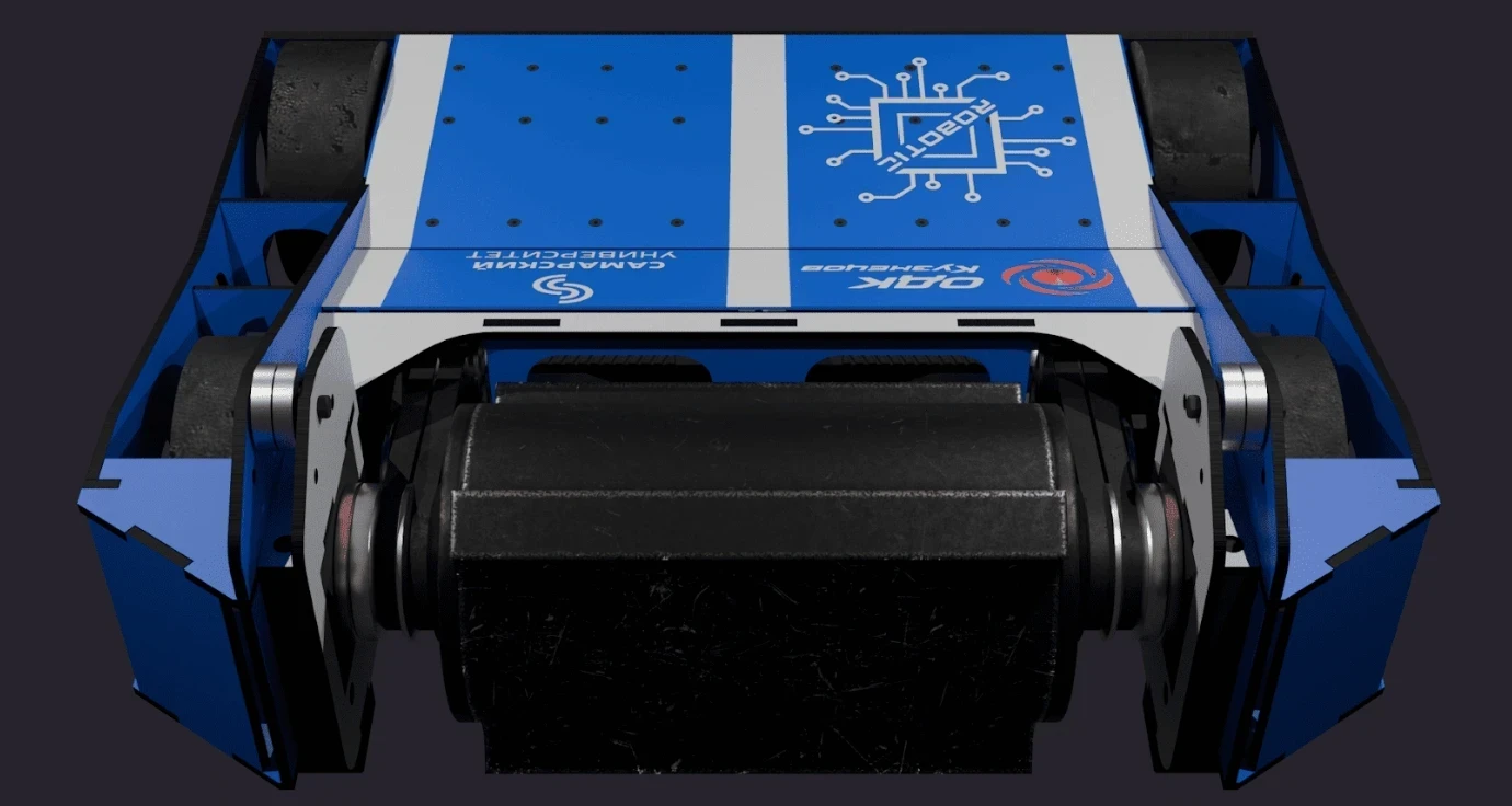 Робот построен на компактной платформе с четырьмя приводными колёсами. Его система управления обеспечивает маневренность и устойчивость, позволяя точно регулировать движение. В центральной части конструкции расположен вертикальный вращающийся элемент, отвечающий за основные механические взаимодействия на арене.