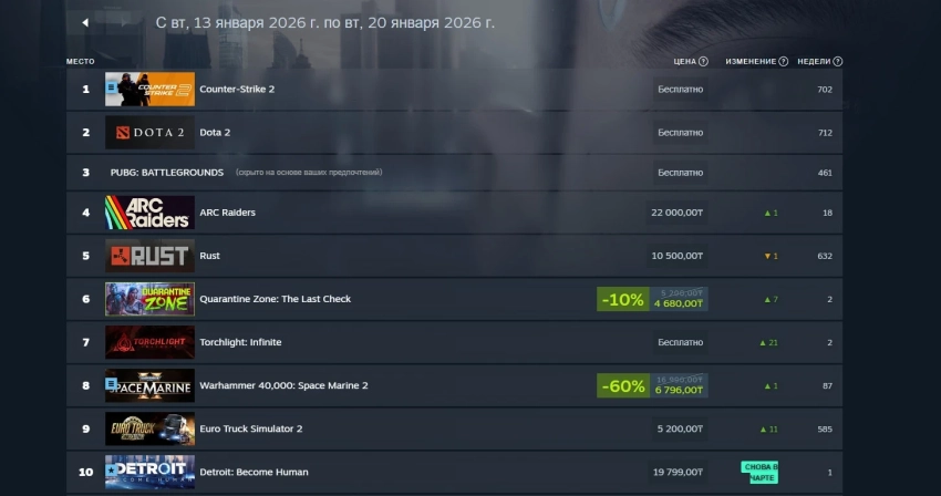 Что касается российского сегмента Steam, то первая тройка из условно-бесплатных игр не поменялась — это Counter-Strike 2, Dota 2 и PUBG: Battlegrounds. Симулятор Quarantine Zone: The Last Check занял шестую строчку, обогнав Torchlight: Infinite. А топ-10 закрывает Detroit: Become Human, на которую неожиданно поднялась цена в ряде регионов.
