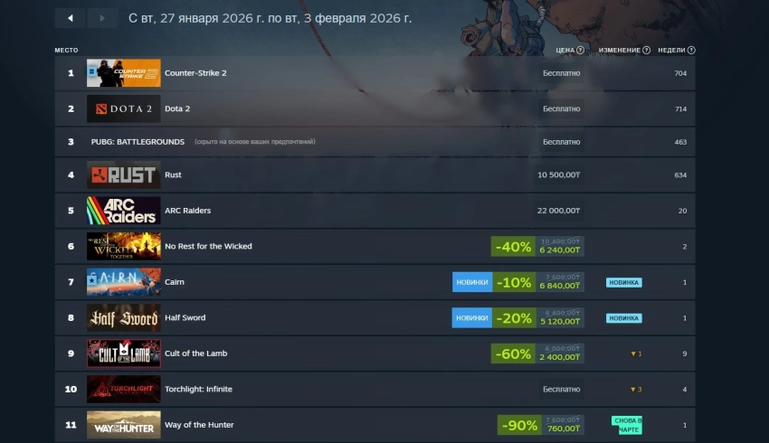 Топ-10 продуктов по выручке в Steam за период с 27 января по 3 февраля 2026 года
