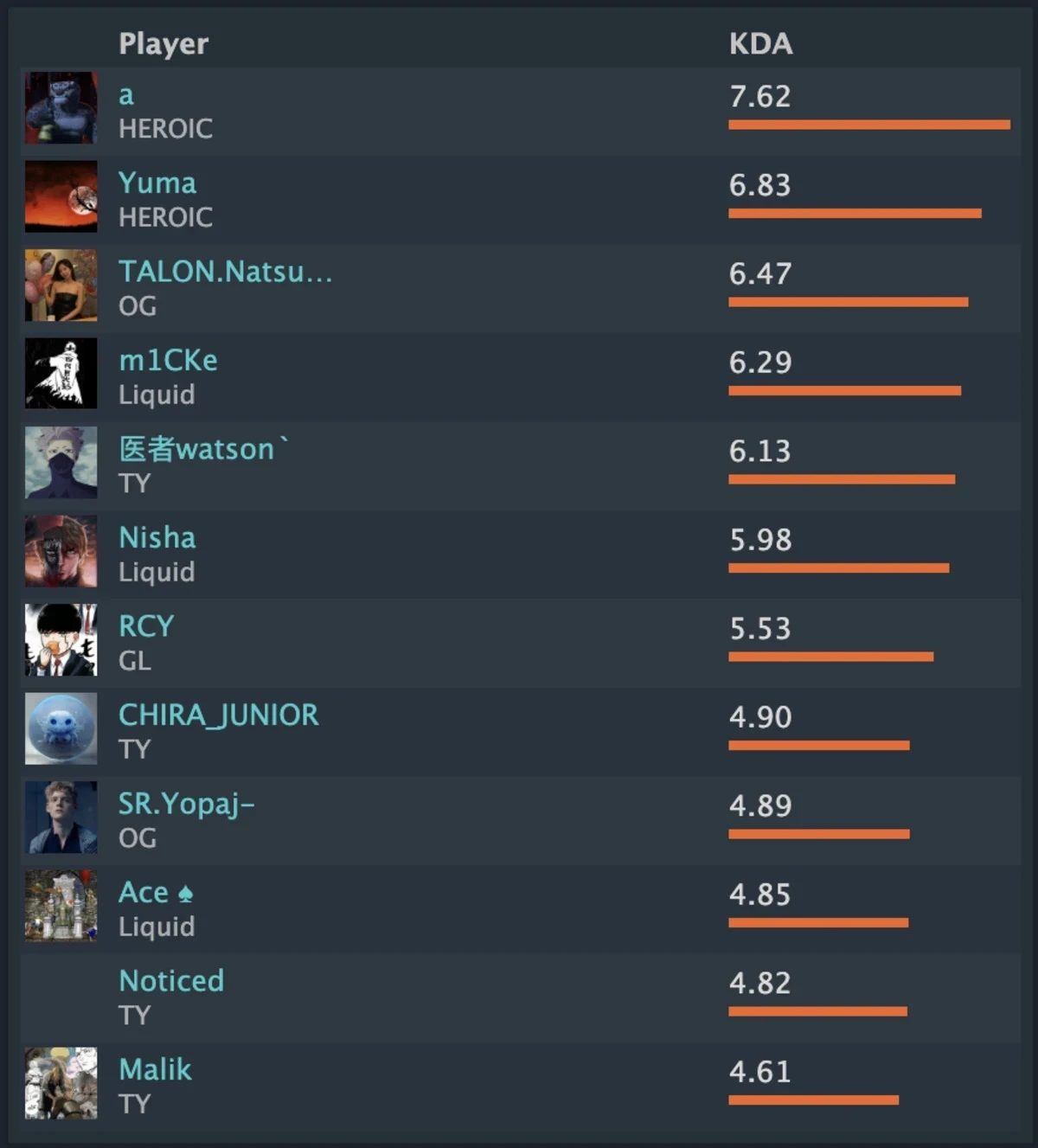 - 2 место: На второй строчке расположился его тиммейт — керри Юма «Yuma» Ланглет с результатом 6.83.