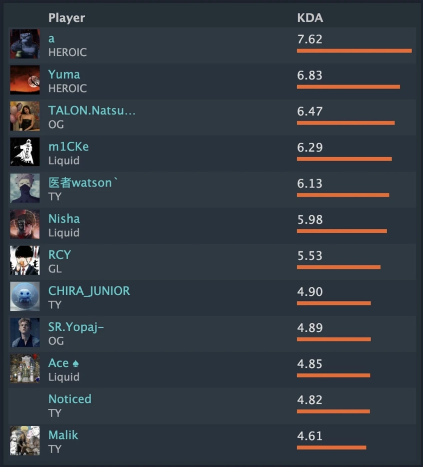 - Между ними вклинился керри Team Yandex Алимжан «watson» Исламбеков с KDA 6.13.